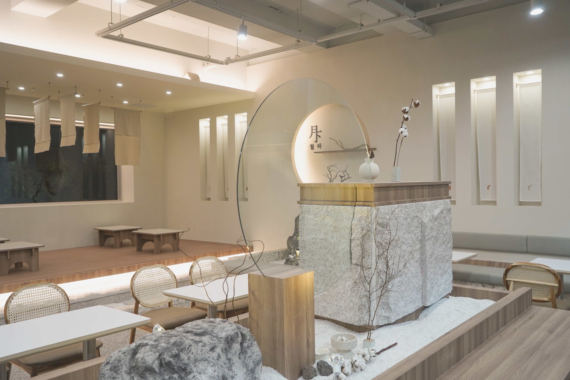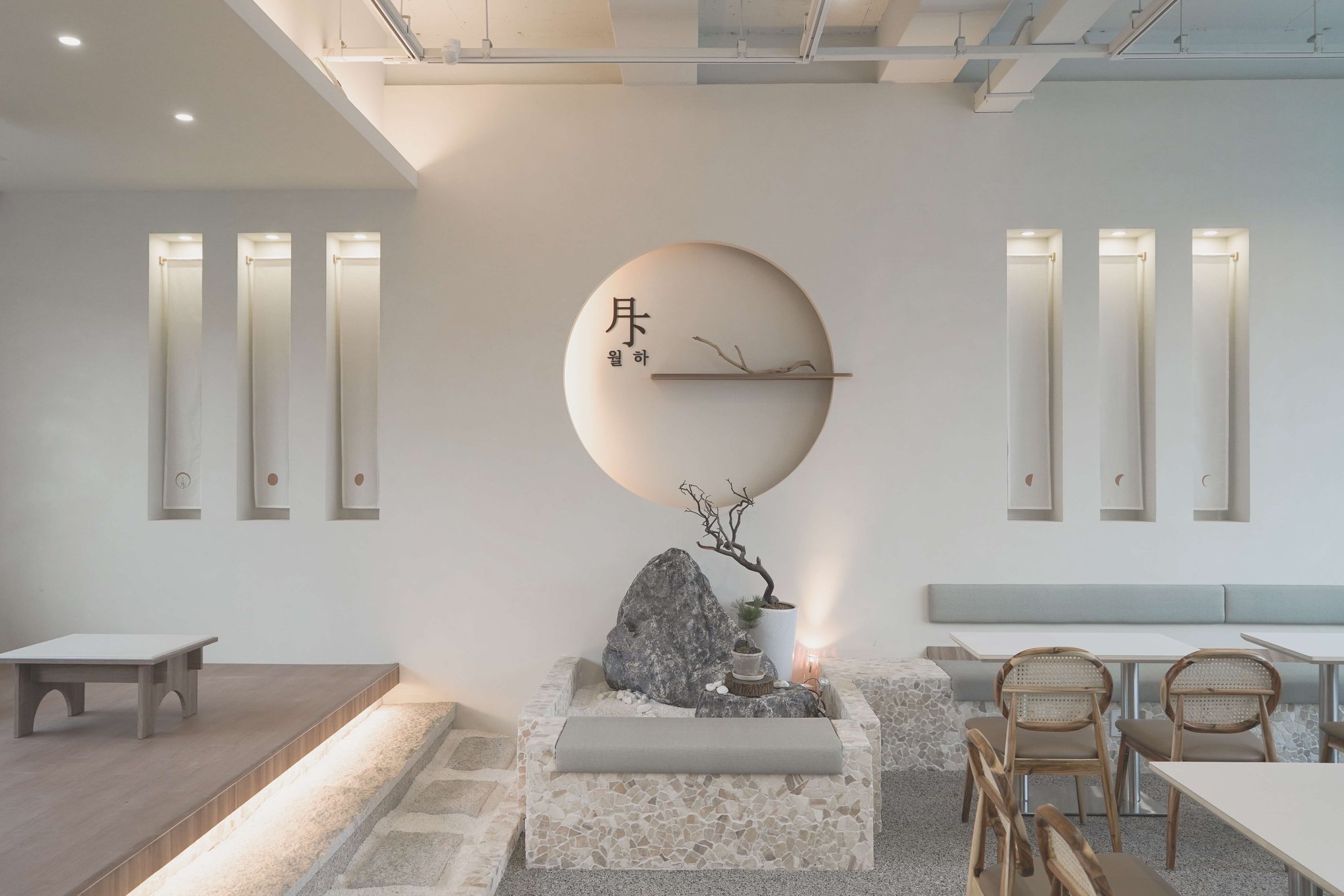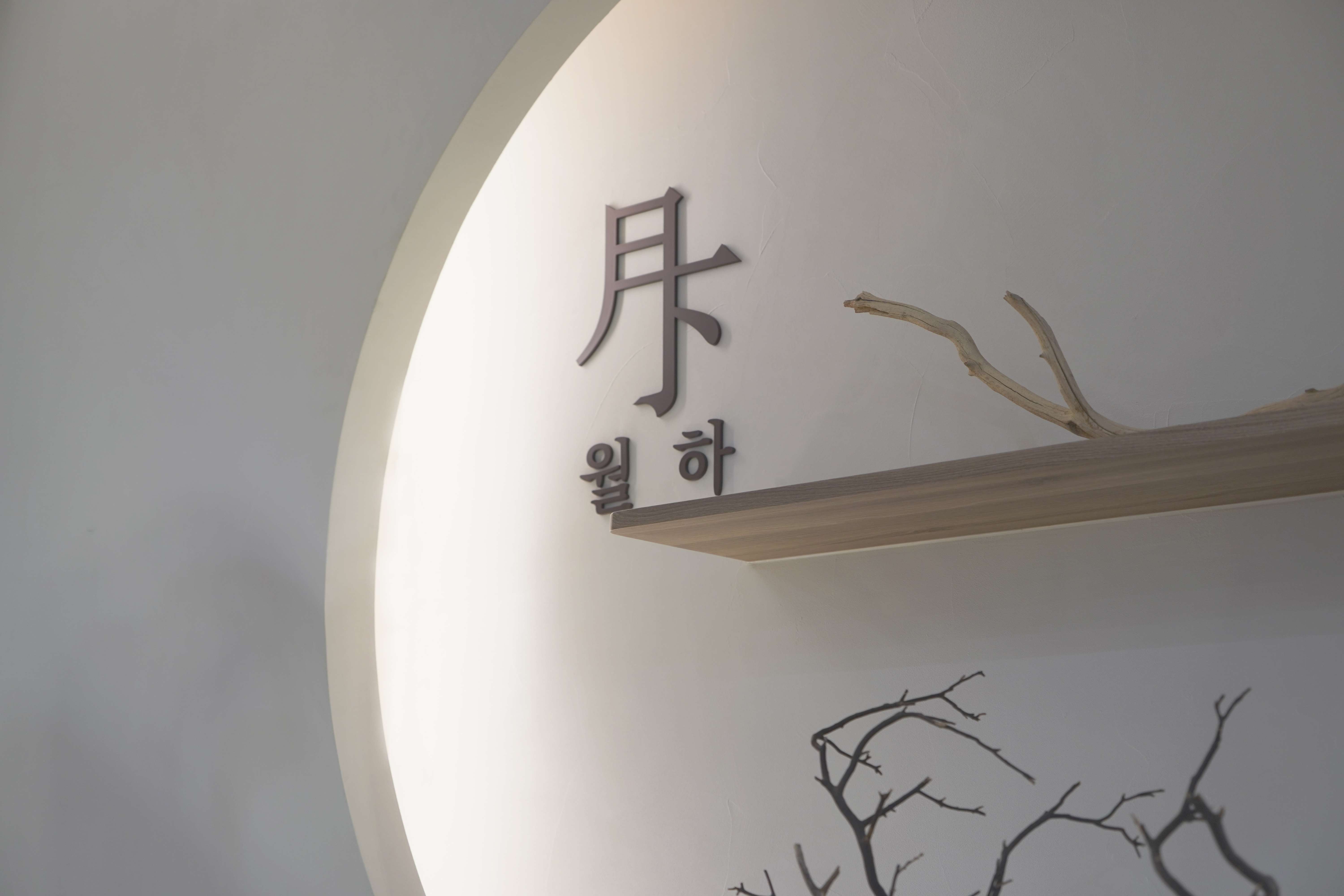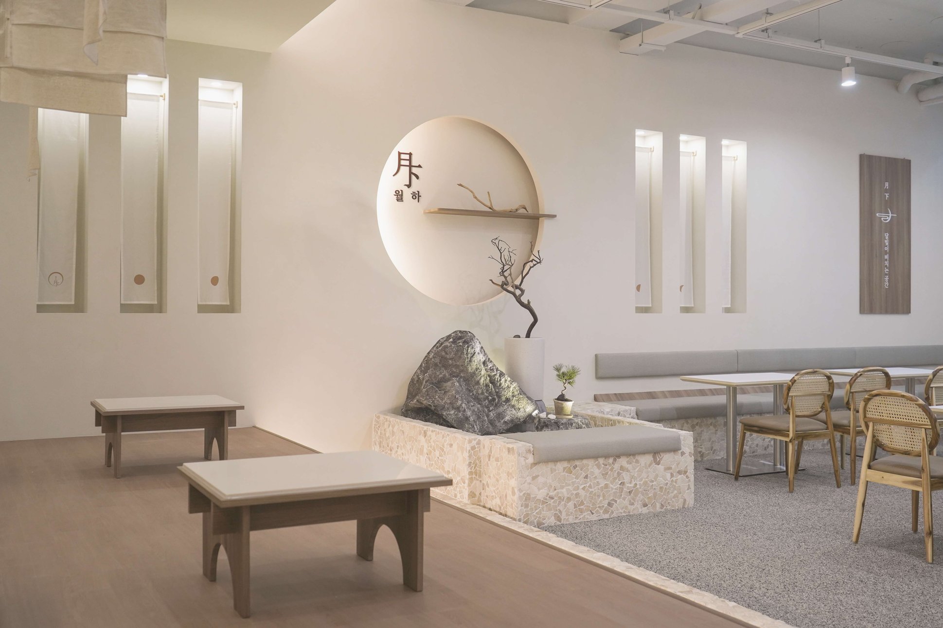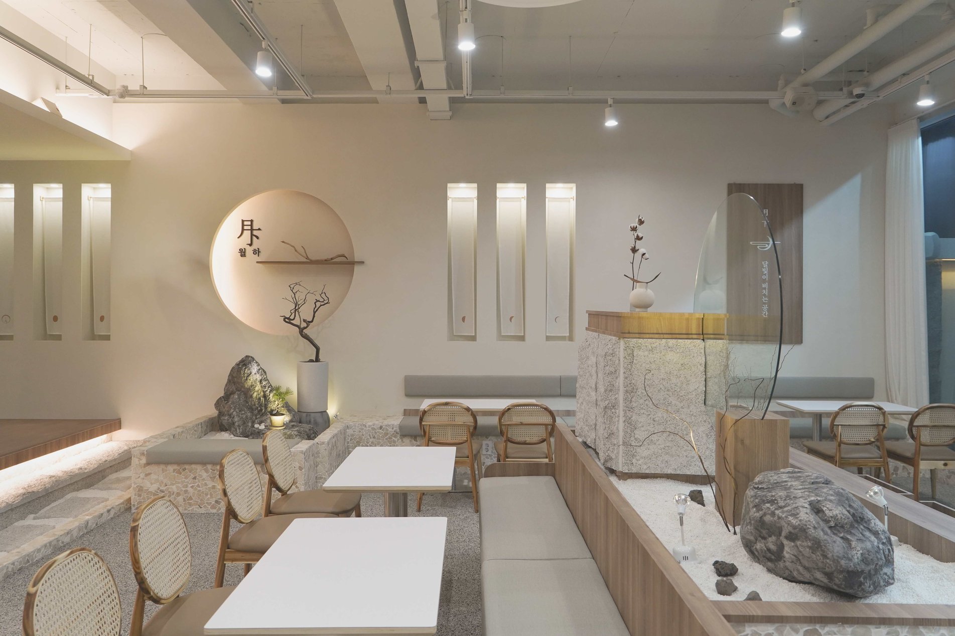 보름달 형태의 벽 조형과 간접조명 디자인으로 보름달과 초승달의 이중적 의미를 상징함 은은한 조도와 간접조명으로 공간의 깊이감 형성 천장에 달린 한지 느낌의 천 설치로 부유하는 듯한 정적인 분위기 연출 콩자갈과 자연석 타일, 마른 나뭇가지 등 자연물 활용한 한국적인 실내 조경 좌식 테이블과 원목 소재 가구로 한국 전통의 좌식 문화 반영