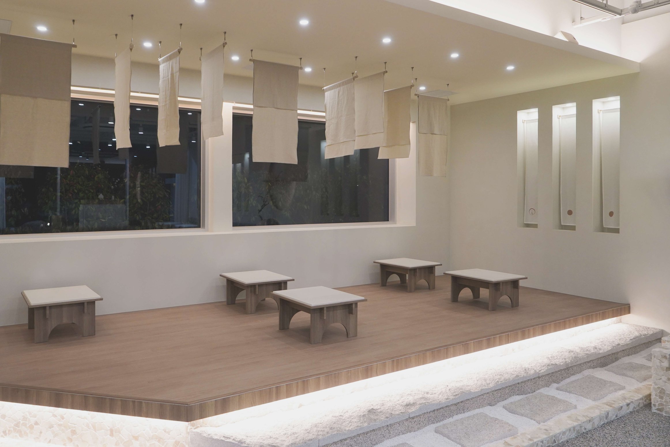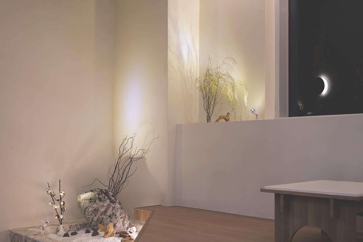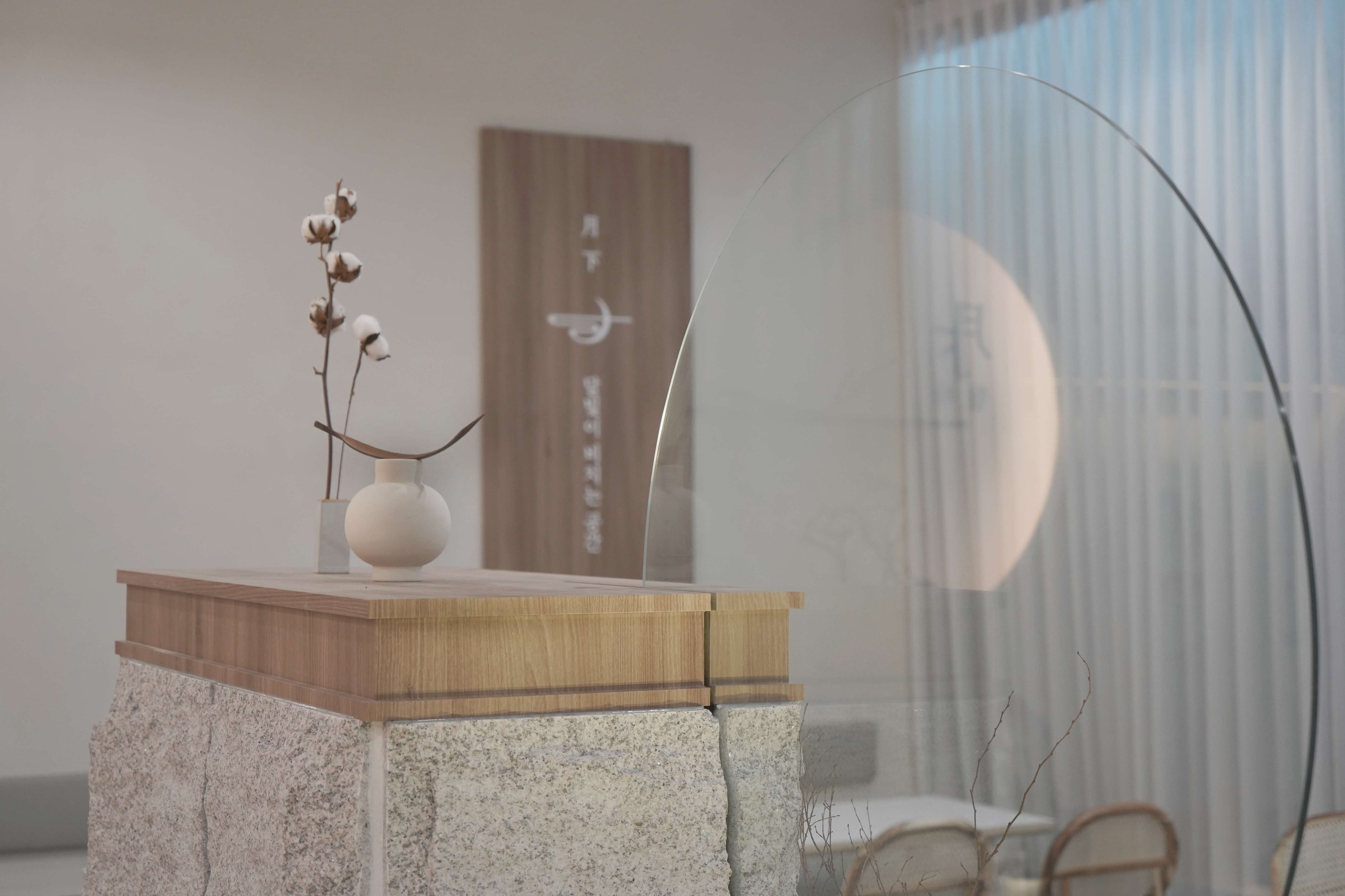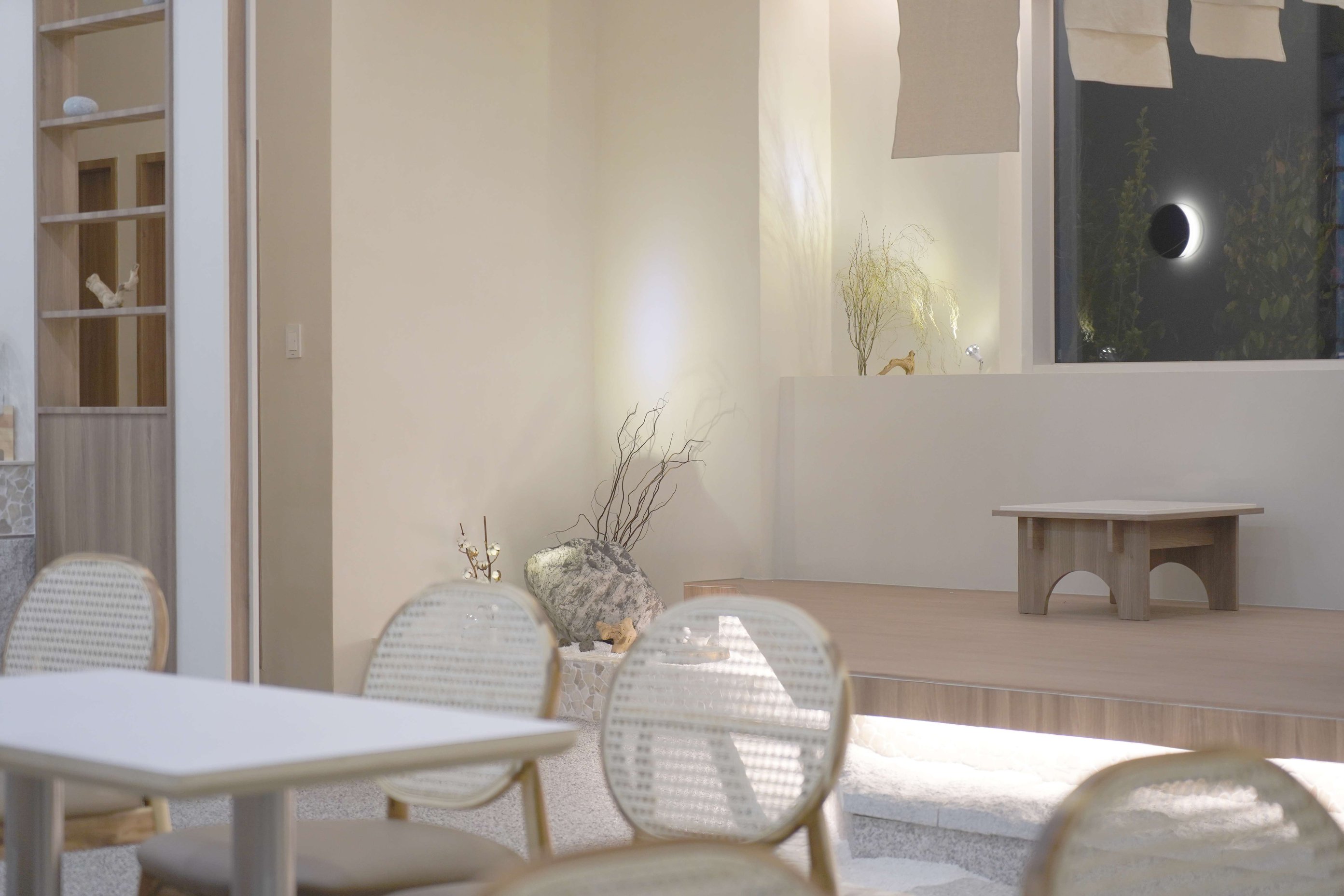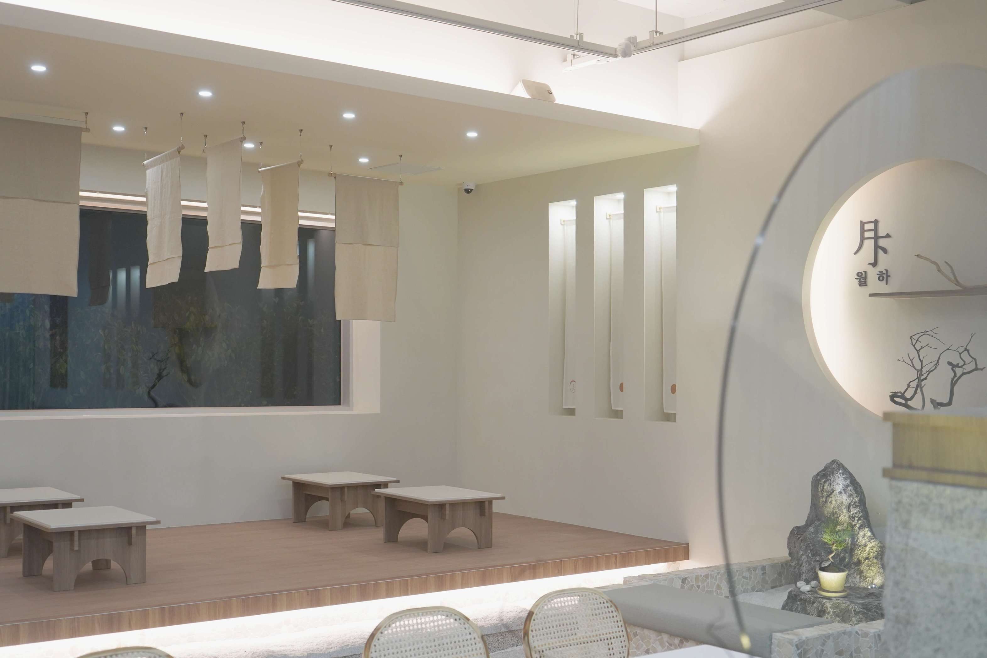보름달 형태의 벽 조형과 간접조명 디자인으로 보름달과 초승달의 이중적 의미를 상징함 은은한 조도와 간접조명으로 공간의 깊이감 형성 천장에 달린 한지 느낌의 천 설치로 부유하는 듯한 정적인 분위기 연출 콩자갈과 자연석 타일, 마른 나뭇가지 등 자연물 활용한 한국적인 실내 조경 좌식 테이블과 원목 소재 가구로 한국 전통의 좌식 문화 반영