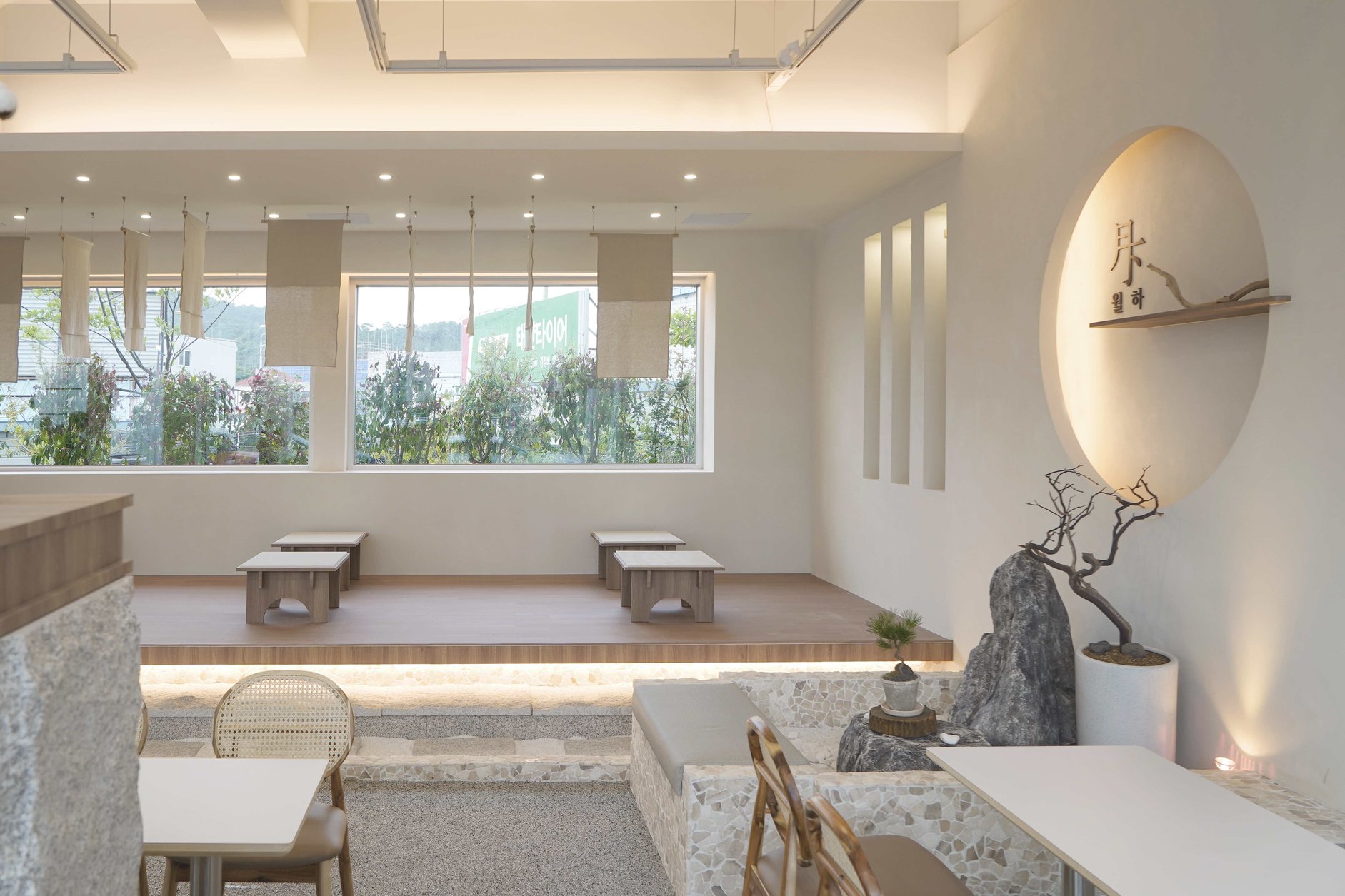 ‘달 아래’라는 뜻의 월하(月下)는 한국적인 미감을 현대적인 공간으로 풀어낸 감성 카페다. 차분한 색감과 절제된 형태, 그리고 자연 소재를 활용한 공간 연출을 통해 고요하고 여백이 느껴지는 분위기를 전달하고자 했다.