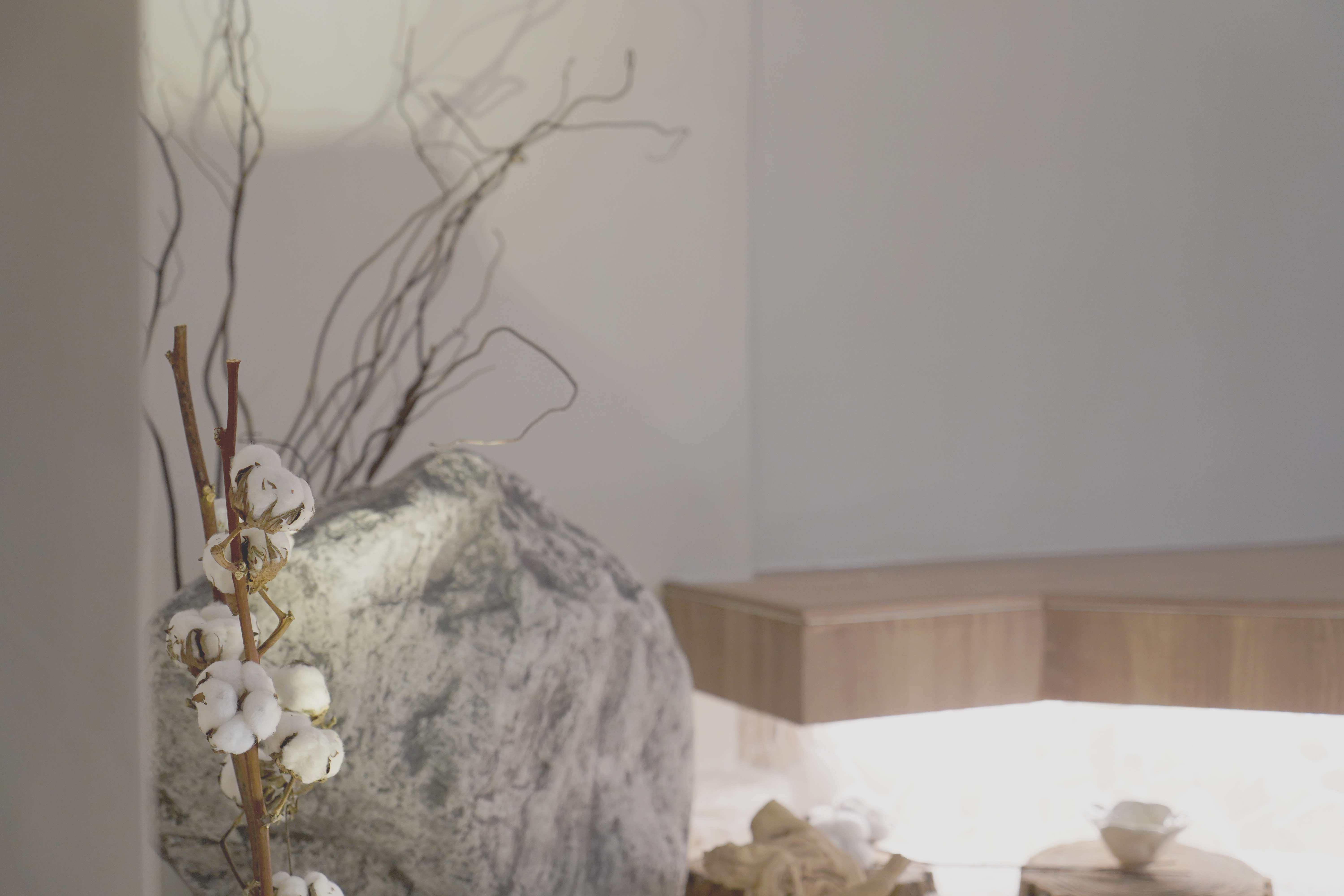 콩자갈, 자연석, 우드, 패브릭(한지 느낌의 린넨), 백색 도장 벽체