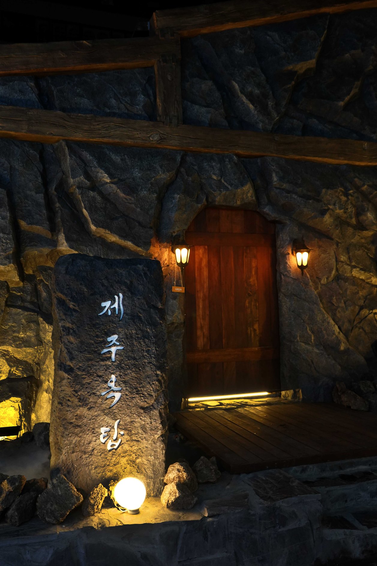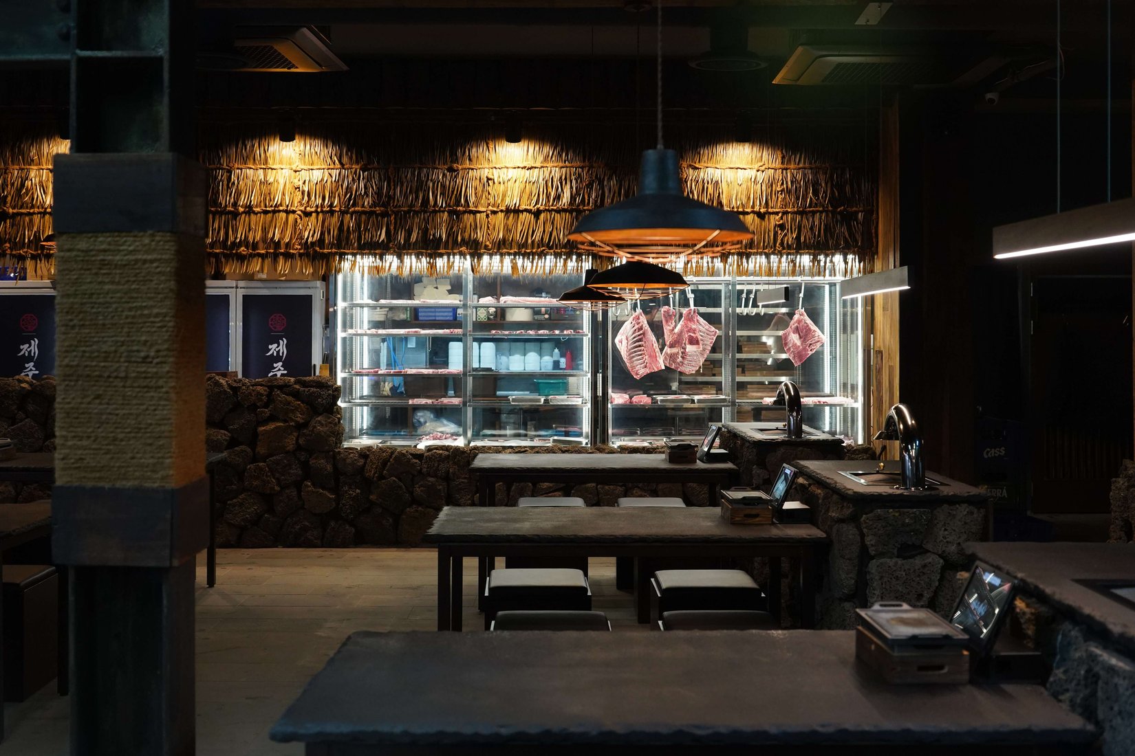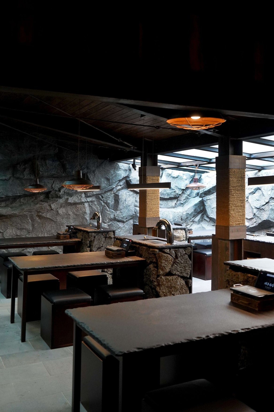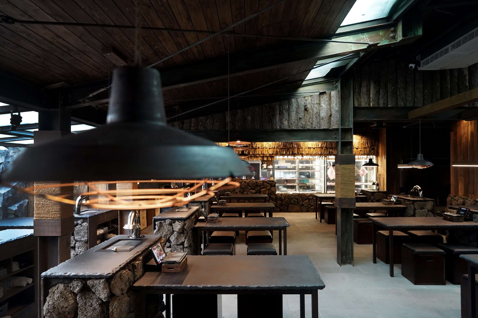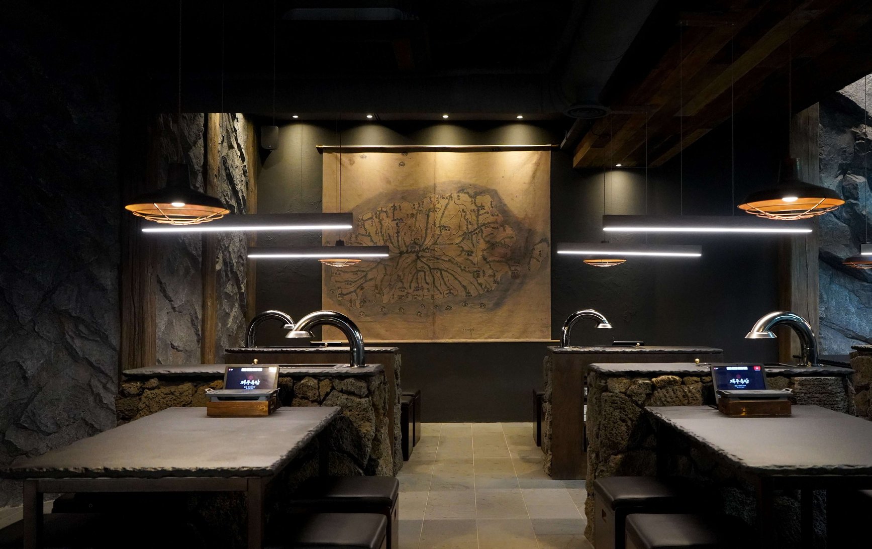 용두암을 형상화한 입체적인 암석 벽면 디자인 제주도 특유의 현무암 돌과 자연석 마감 초가지붕 형태의 고기 진열장으로 친근하고 따뜻한 분위기 연출 실내·외 수경 연출(안개 연출 포함)을 통한 신비로움 연출 목재와 금속이 조화된 무게감 있는 가구와 조명 구성옛날 제주도의 지도연출로 공간의 시간의 깊이 연출 원목과 자연석 디테일을 활용한 입구와 외관 디자인