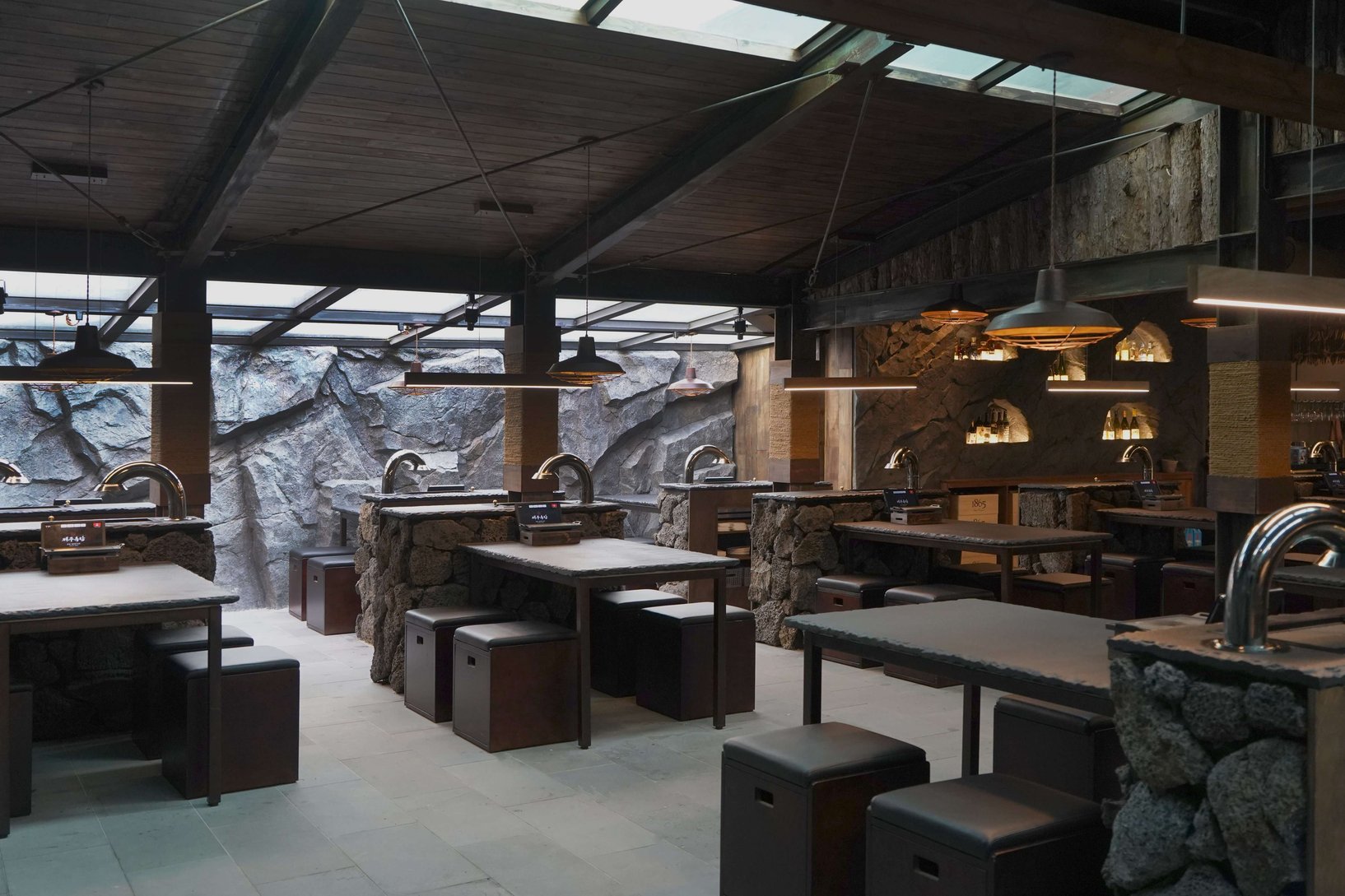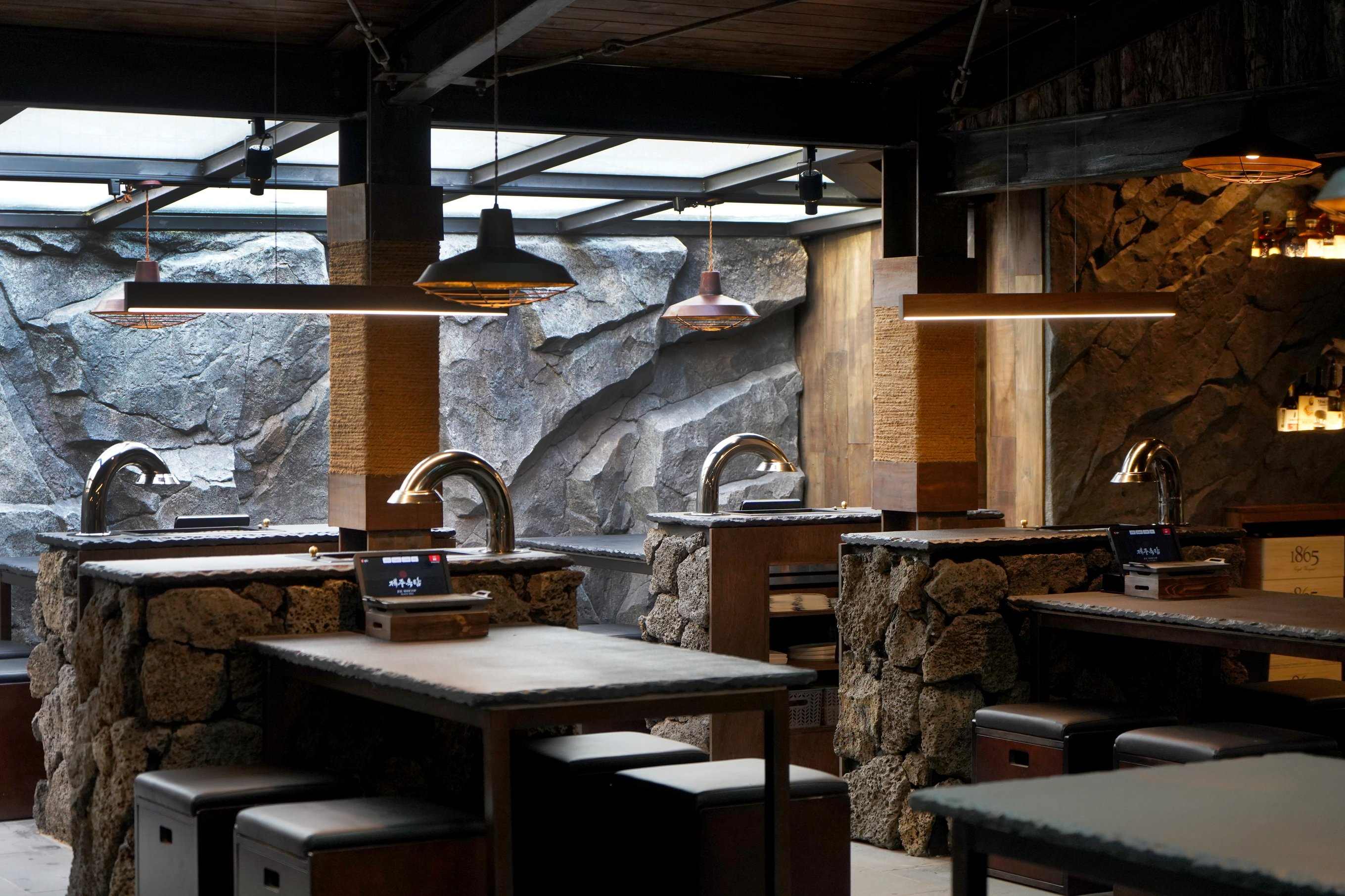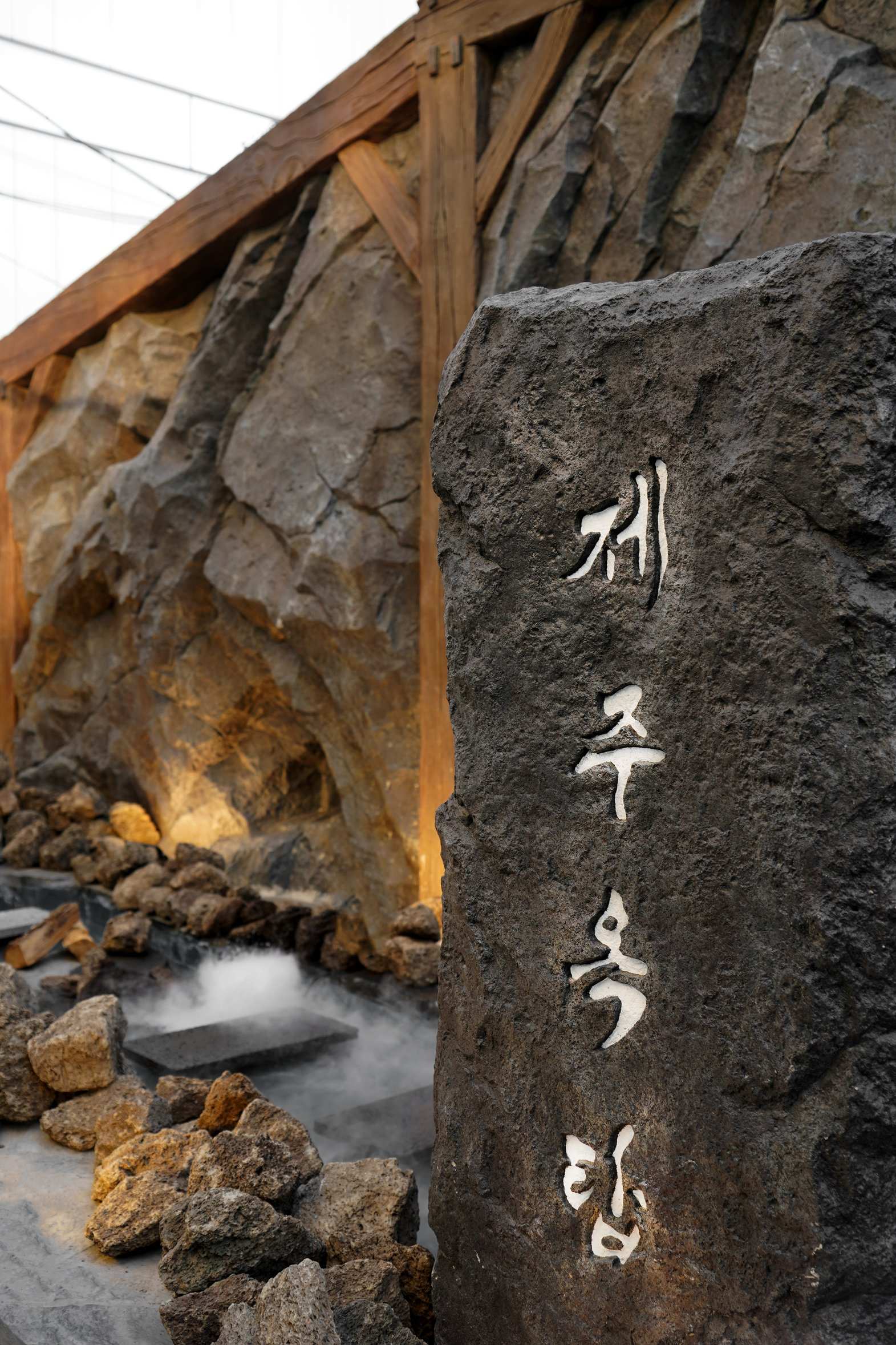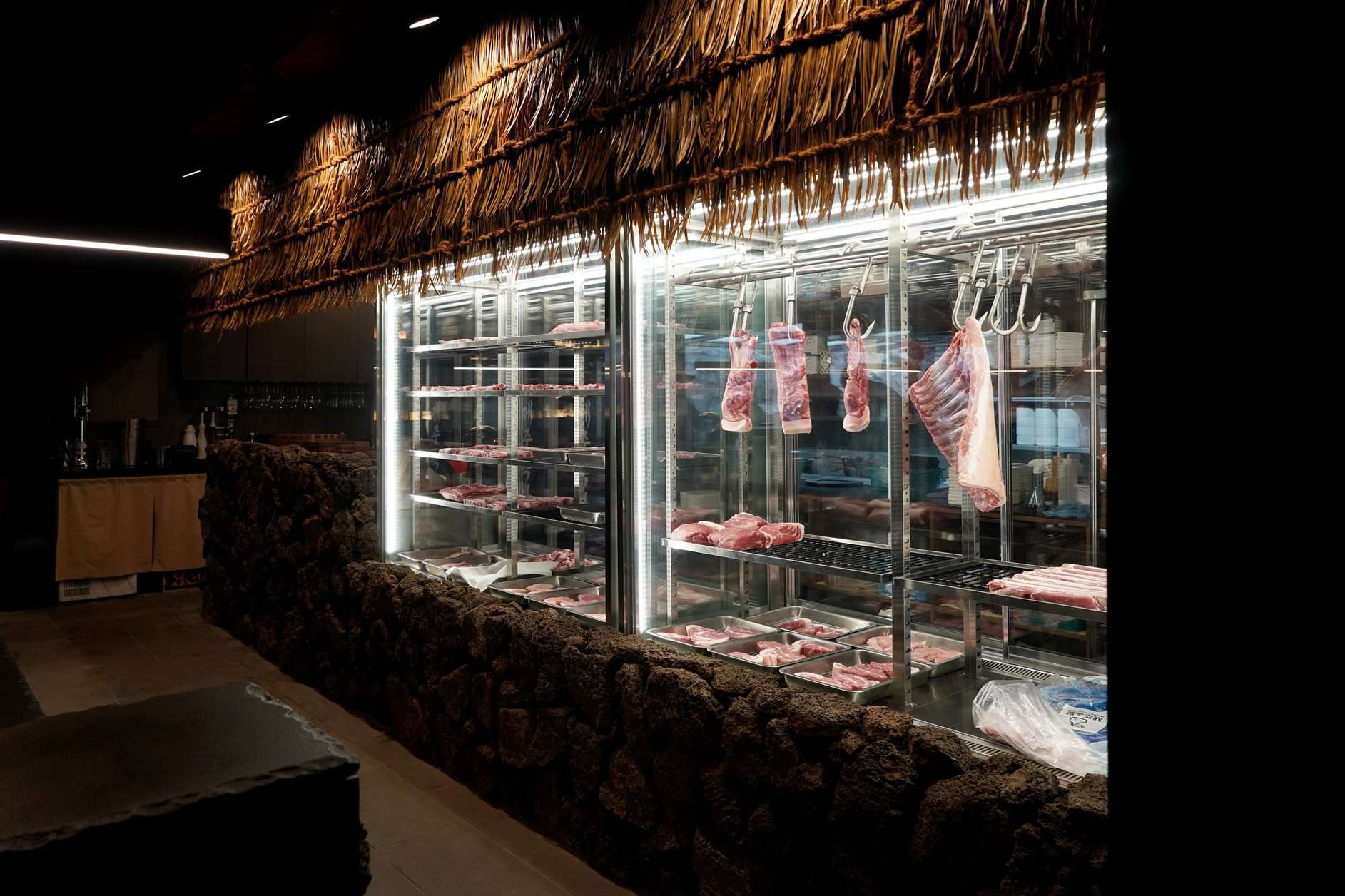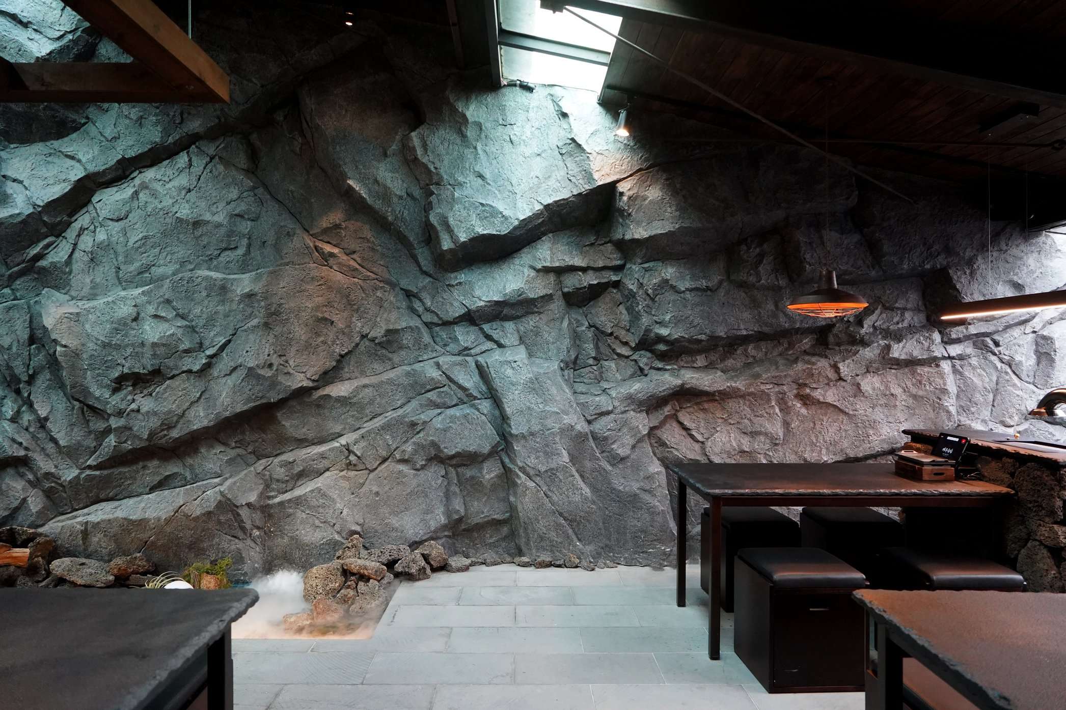 용두암을 형상화한 입체적인 암석 벽면 디자인 제주도 특유의 현무암 돌과 자연석 마감 초가지붕 형태의 고기 진열장으로 친근하고 따뜻한 분위기 연출 실내·외 수경 연출(안개 연출 포함)을 통한 신비로움 연출 목재와 금속이 조화된 무게감 있는 가구와 조명 구성옛날 제주도의 지도연출로 공간의 시간의 깊이 연출 원목과 자연석 디테일을 활용한 입구와 외관 디자인