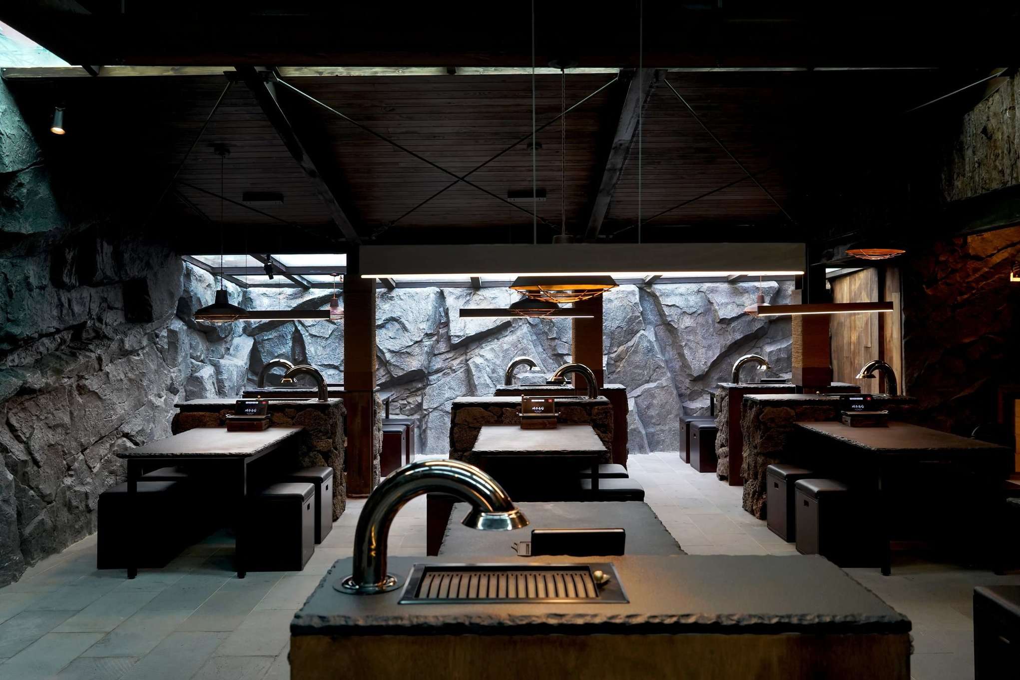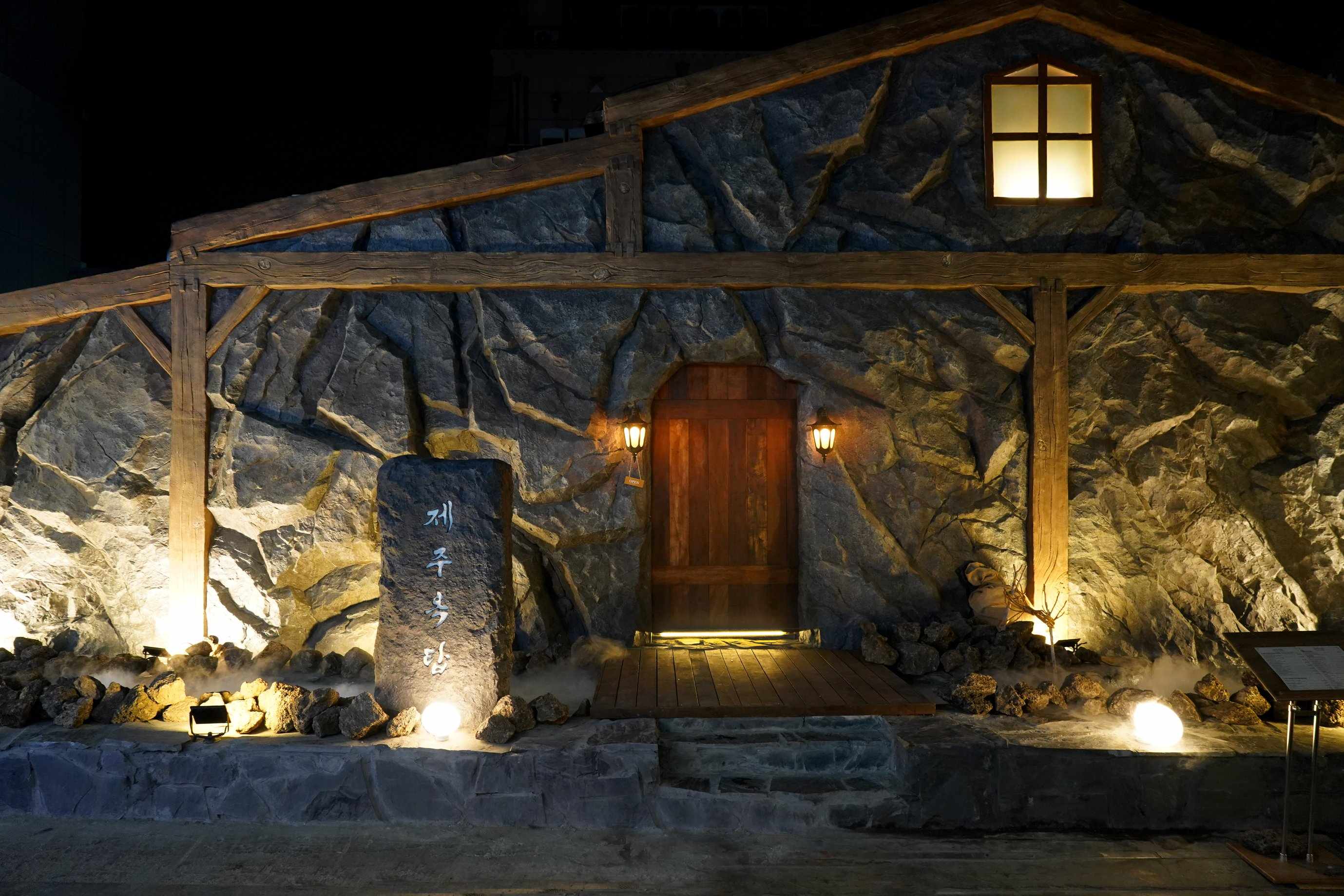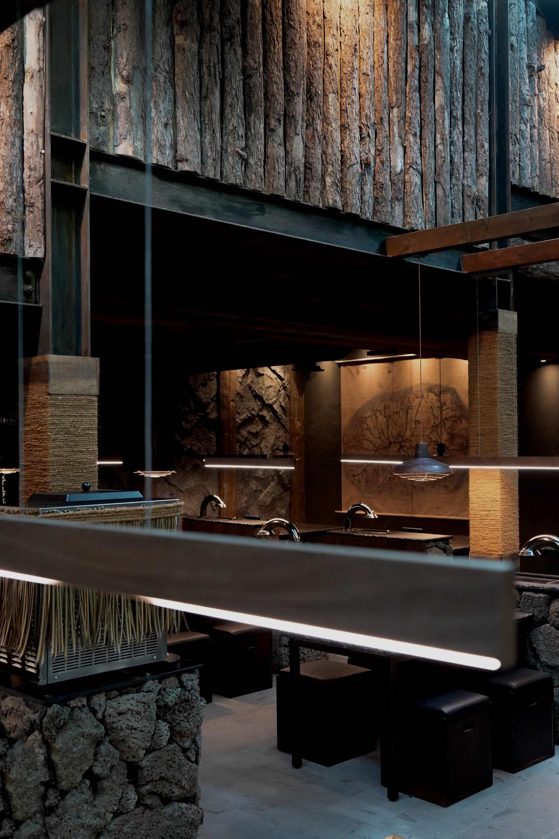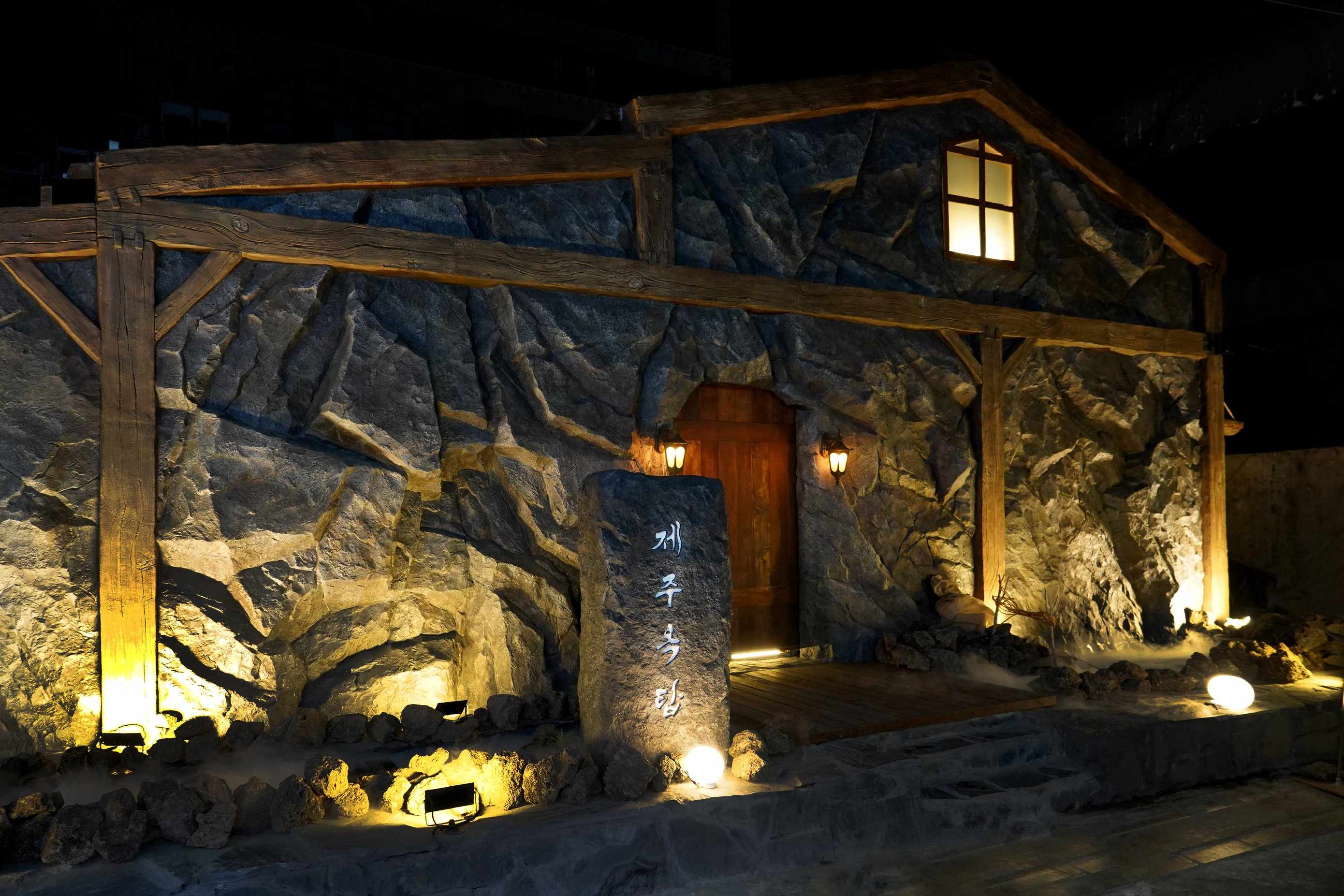 용두암을 형상화한 입체적인 암석 벽면 디자인 제주도 특유의 현무암 돌과 자연석 마감 초가지붕 형태의 고기 진열장으로 친근하고 따뜻한 분위기 연출 실내·외 수경 연출(안개 연출 포함)을 통한 신비로움 연출 목재와 금속이 조화된 무게감 있는 가구와 조명 구성옛날 제주도의 지도연출로 공간의 시간의 깊이 연출 원목과 자연석 디테일을 활용한 입구와 외관 디자인