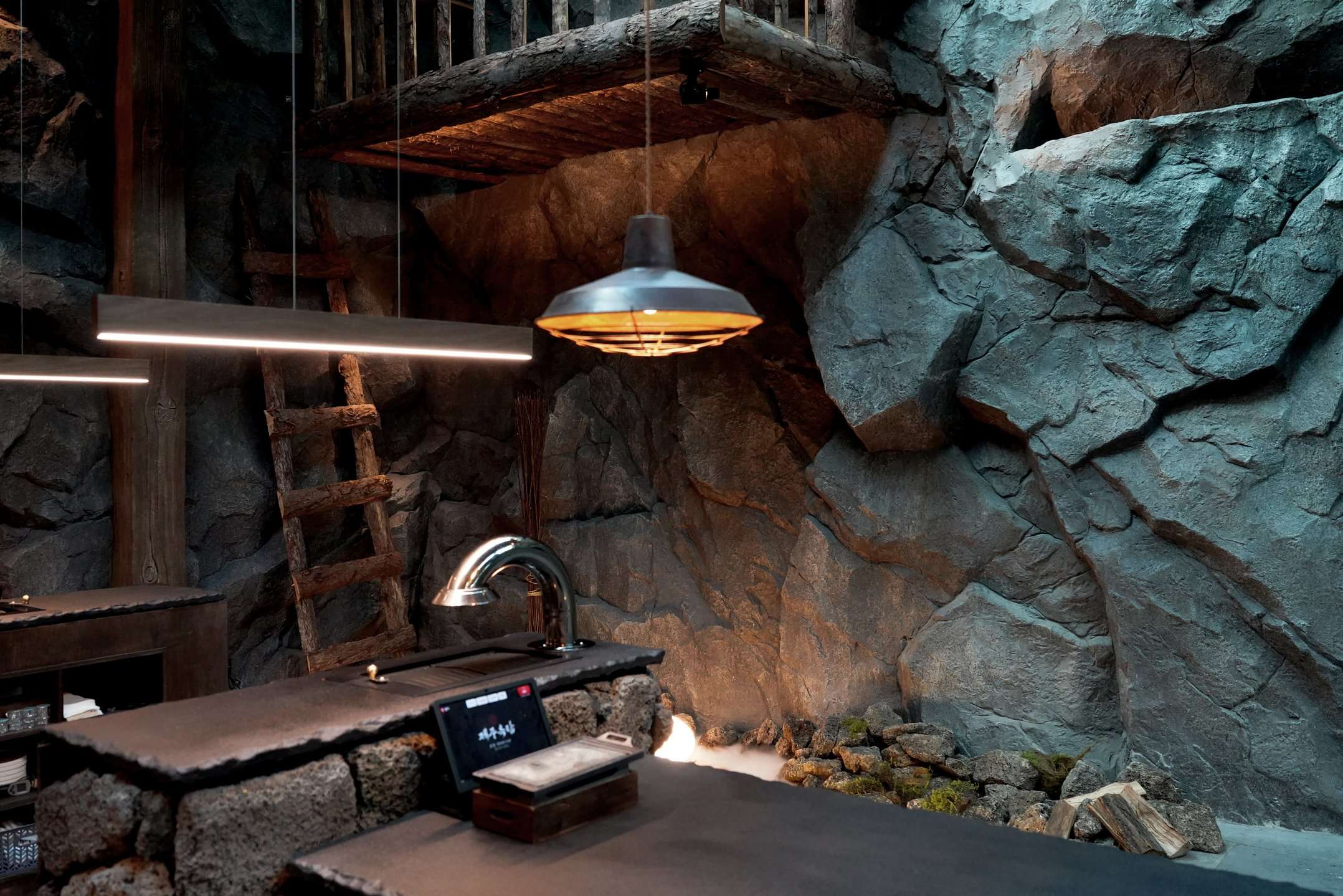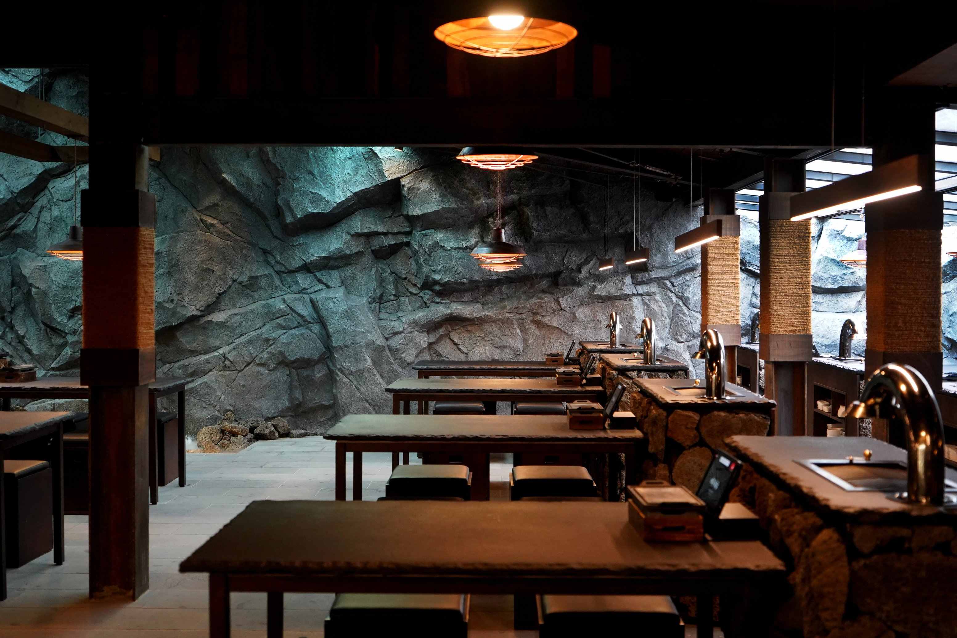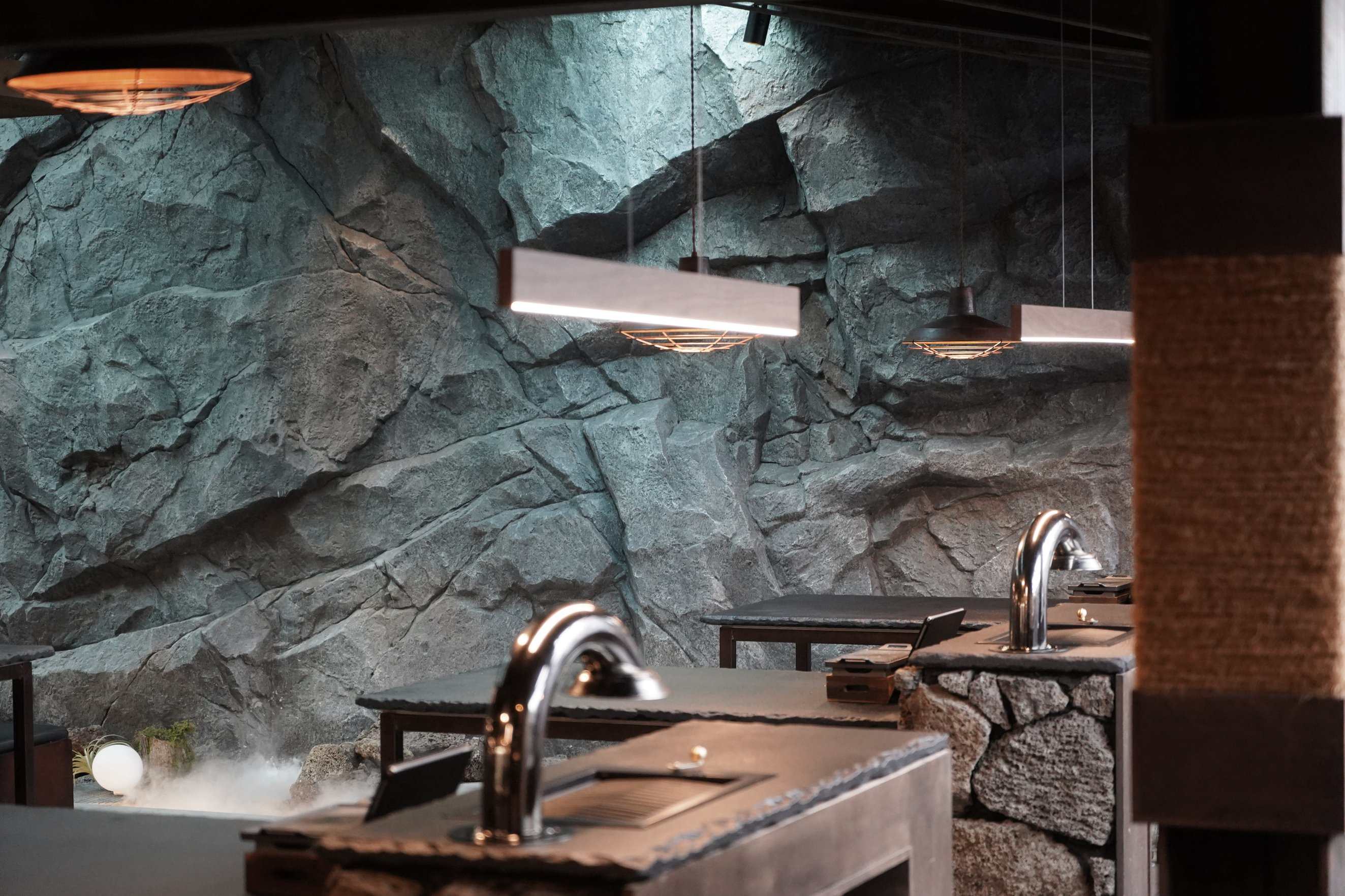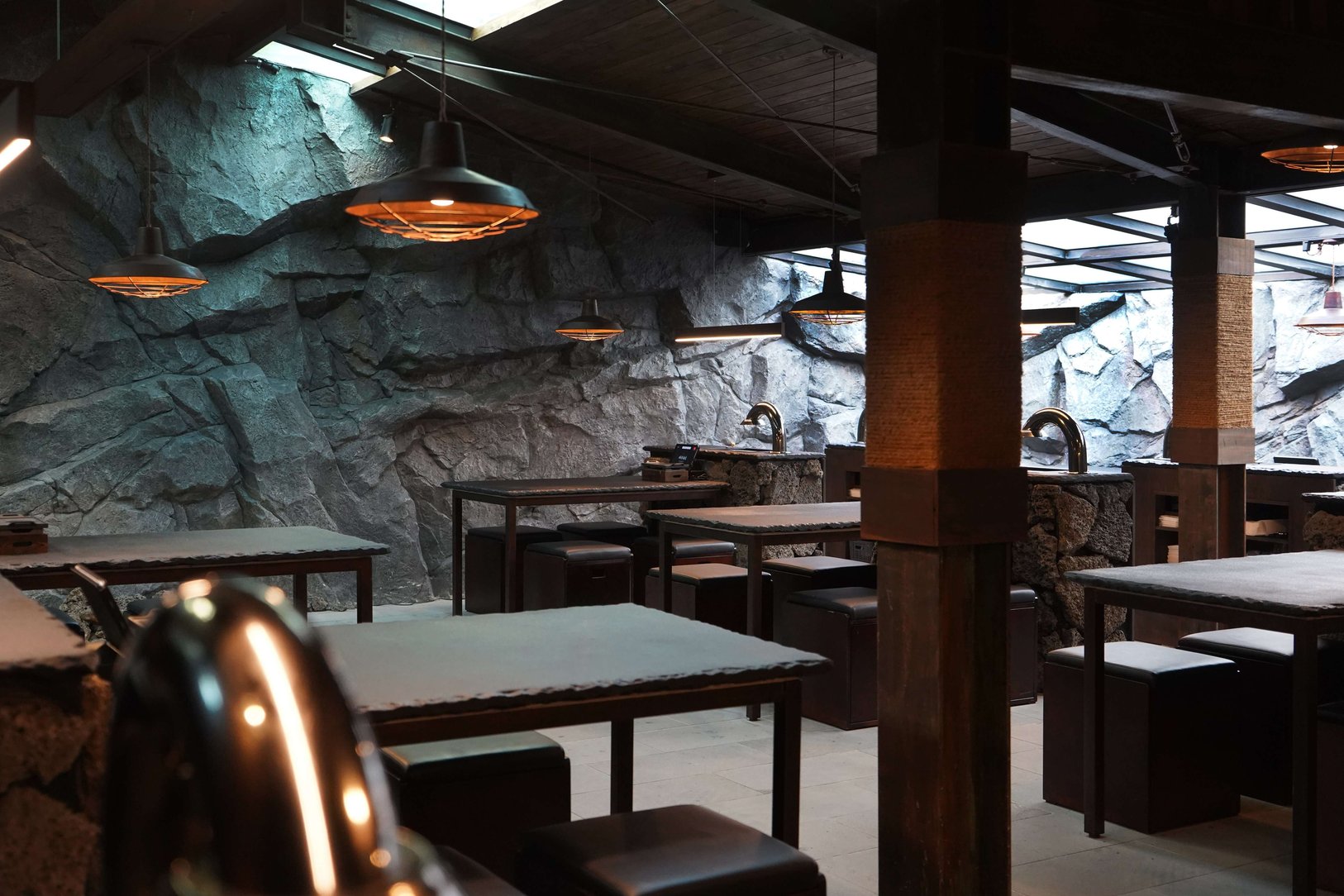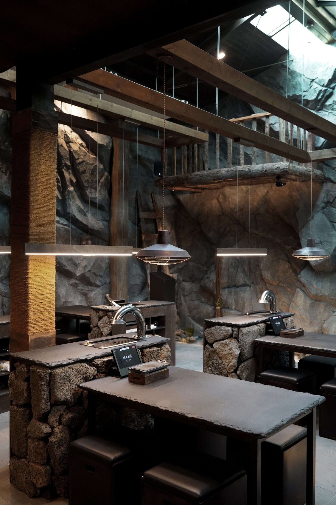용두암을 형상화한 입체적인 암석 벽면 디자인 제주도 특유의 현무암 돌과 자연석 마감 초가지붕 형태의 고기 진열장으로 친근하고 따뜻한 분위기 연출 실내·외 수경 연출(안개 연출 포함)을 통한 신비로움 연출 목재와 금속이 조화된 무게감 있는 가구와 조명 구성옛날 제주도의 지도연출로 공간의 시간의 깊이 연출 원목과 자연석 디테일을 활용한 입구와 외관 디자인