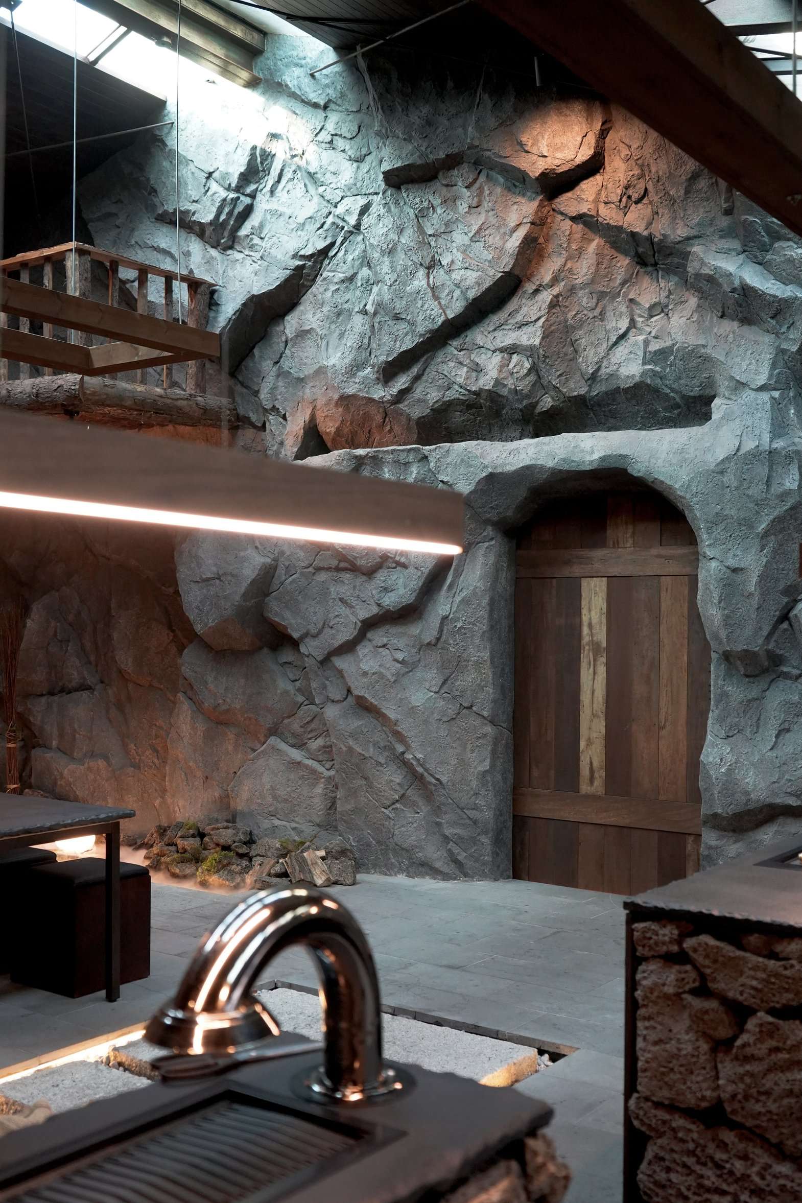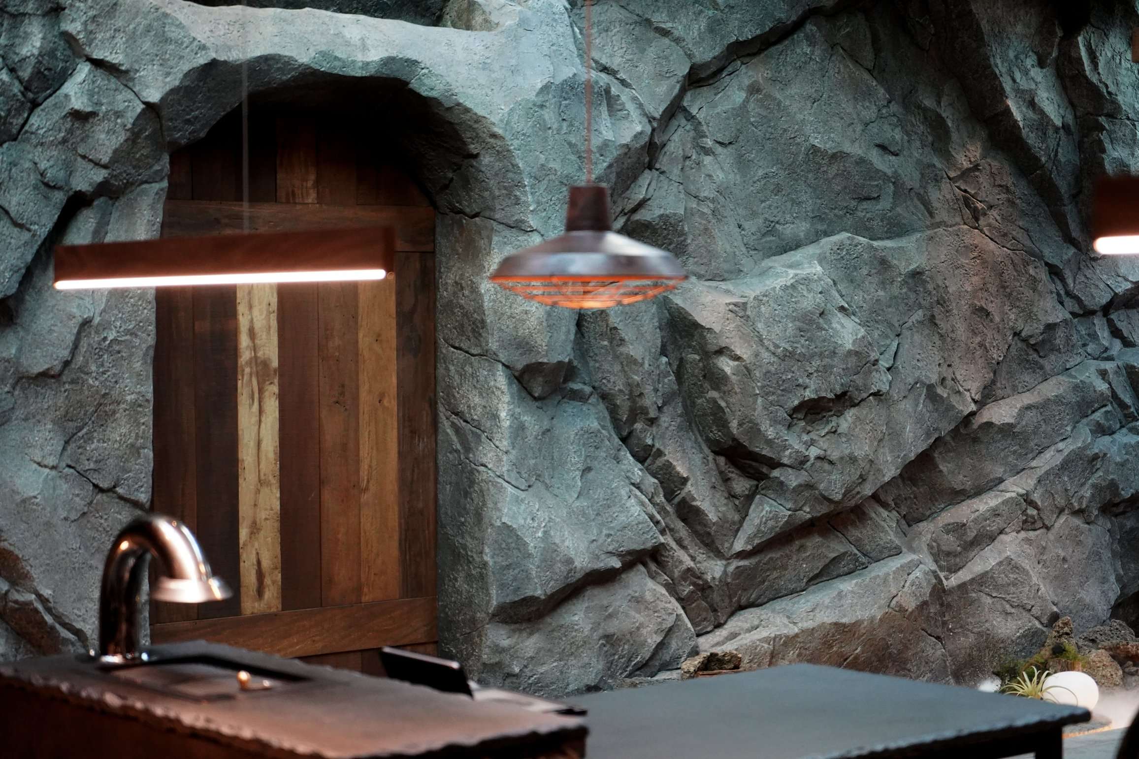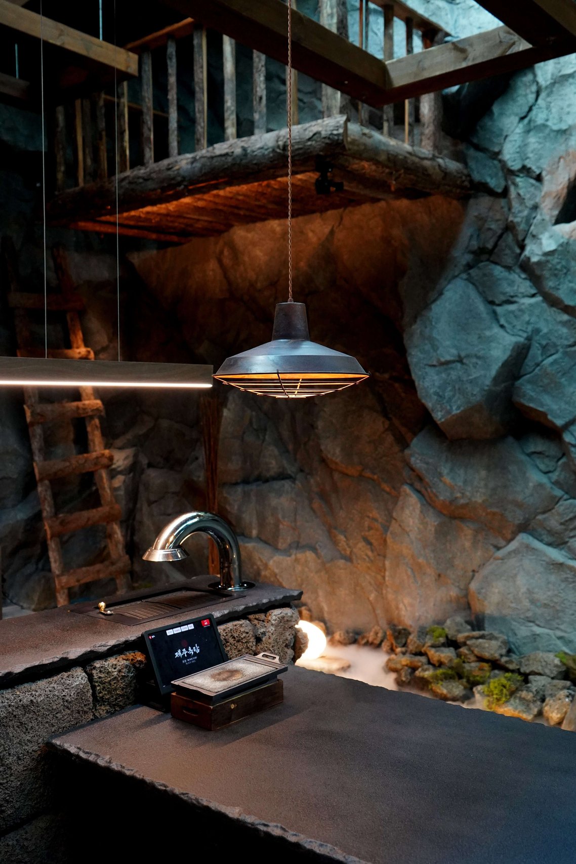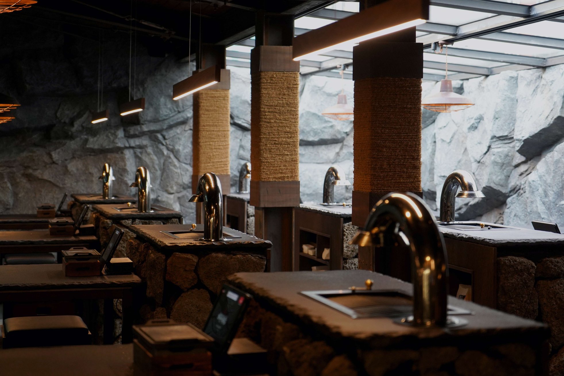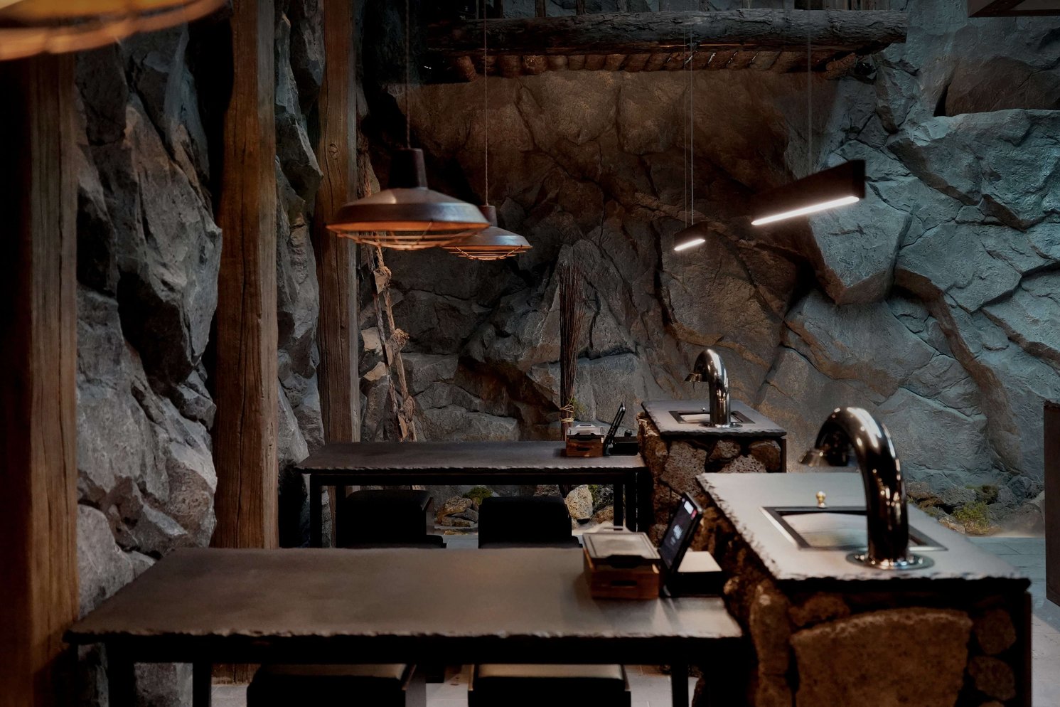 용두암을 형상화한 입체적인 암석 벽면 디자인 제주도 특유의 현무암 돌과 자연석 마감 초가지붕 형태의 고기 진열장으로 친근하고 따뜻한 분위기 연출 실내·외 수경 연출(안개 연출 포함)을 통한 신비로움 연출 목재와 금속이 조화된 무게감 있는 가구와 조명 구성옛날 제주도의 지도연출로 공간의 시간의 깊이 연출 원목과 자연석 디테일을 활용한 입구와 외관 디자인
